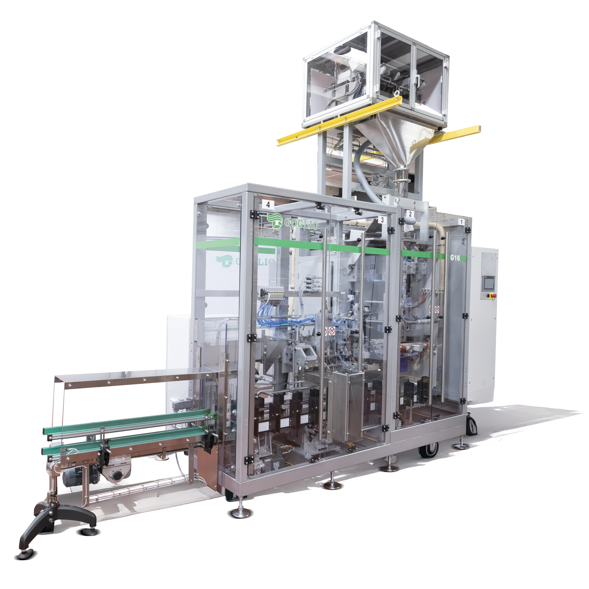 G16 can work with traditional and design for recycling materials; with the fully integrated Goglio valve application station, allows you to make packages in different formats, such as Corner SealTM with 4 vertical seals.